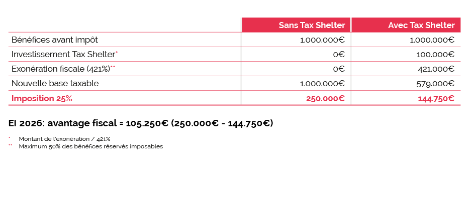 Pour l’exercice d'imposition 2026, l’avantage fiscal correspond à 105,25% du montant de l’opération Tax Shelter sur base d’un taux d’imposition normal de 25%. Le montant de l’investissement est déductible à 421% dans le chef de votre société. En échange de l’investissement dans le projet, l’opération génère une réduction d’impôt immédiate provisoire de 105,25% du montant de l’investissement, soit l’investissement x 421% x 25%. Cette réduction d’impôt génère immédiatement un gain de 5,25% par rapport à une situation non-optimisée.