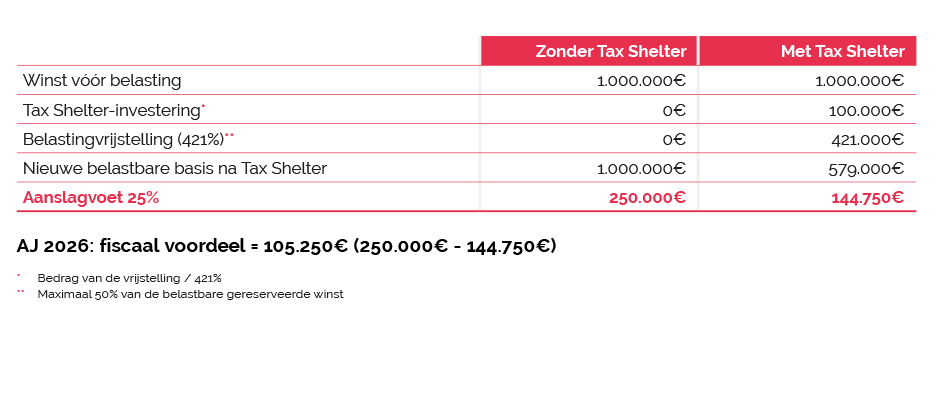 Voor het aanslagjaar 2026 komt het belastingvoordeel overeen met 105,25% van het bedrag van de Tax Shelter transactie op basis van een standaard belastingtarief van 25%. Het bedrag van de investering is voor uw bedrijf aftrekbaar tegen 421%. In ruil voor de investering in het project genereert de operatie een onmiddellijke voorlopige belastingvermindering van 105,25% van het bedrag van de investering, d.w.z. de investering x 421% x 25%. Deze belastingverlaging levert onmiddellijk een winst van 5,25% op ten opzichte van een niet-geoptimaliseerde situatie.